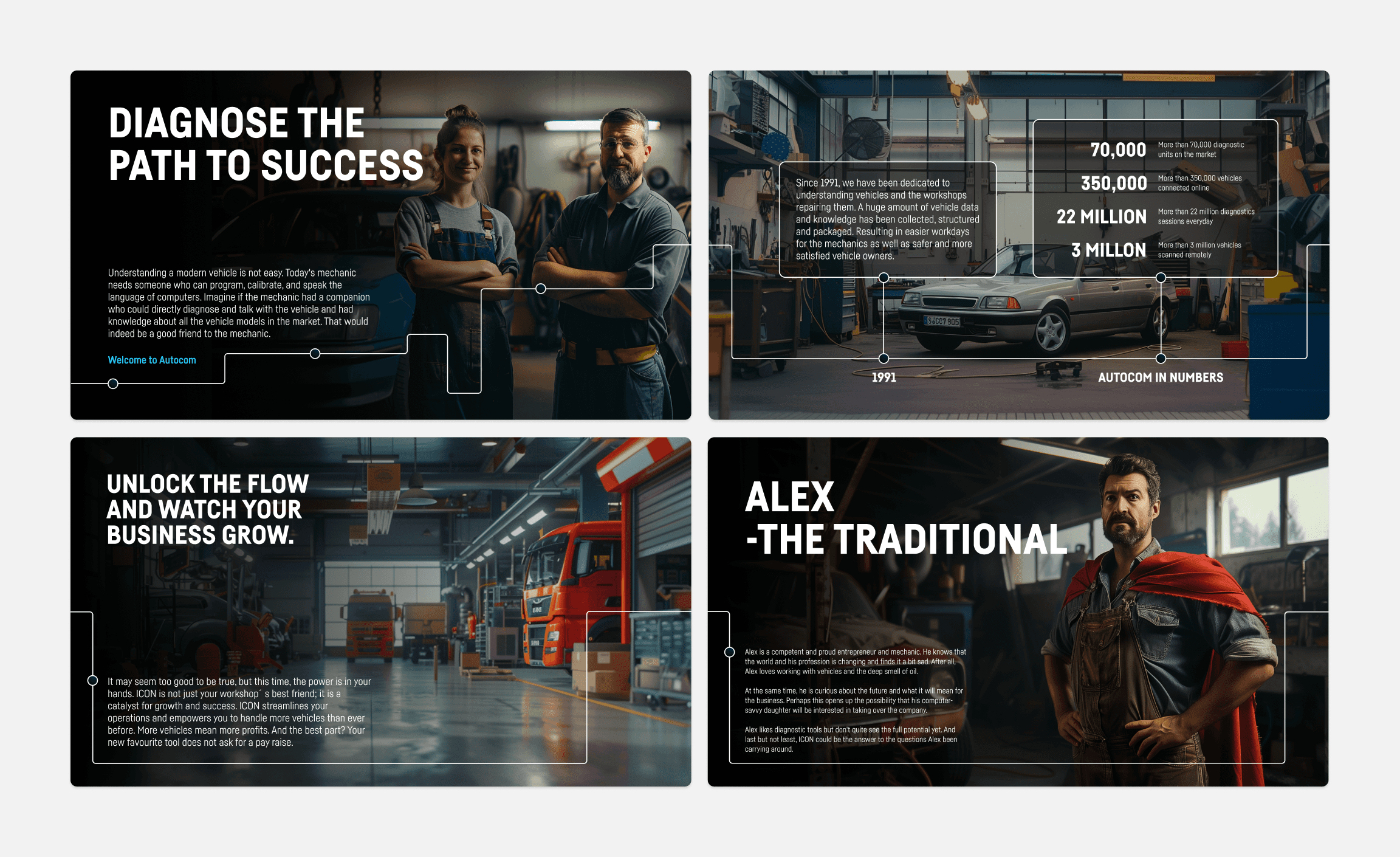 Autocom develops professional diagnostic tools and software for vehicle workshops. For a sales handbook they wanted a consistent set of visuals with a life-like 3D and AI-forward vibe. Something that signaled modern technology while still feeling approachable and vehicle-focused. AI let me quickly explore multiple scenarios, angles, and moods within one cohesive visual direction, and build imagery that matched the handbook’s messaging without relying on traditional photo production. The result was a flexible image system that felt future-facing, on-brand, and easy to scale across sections and formats.